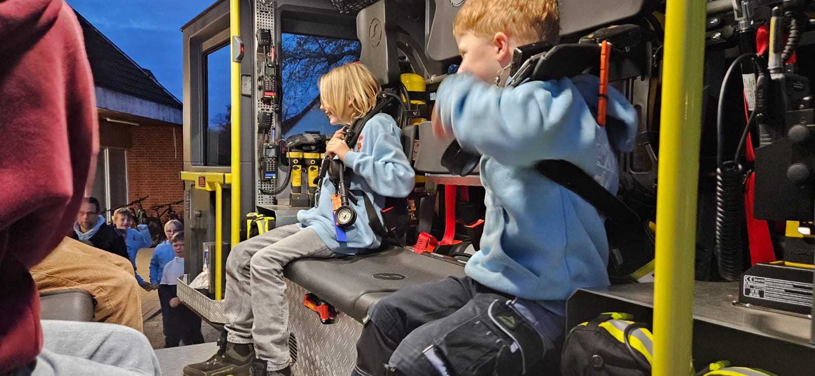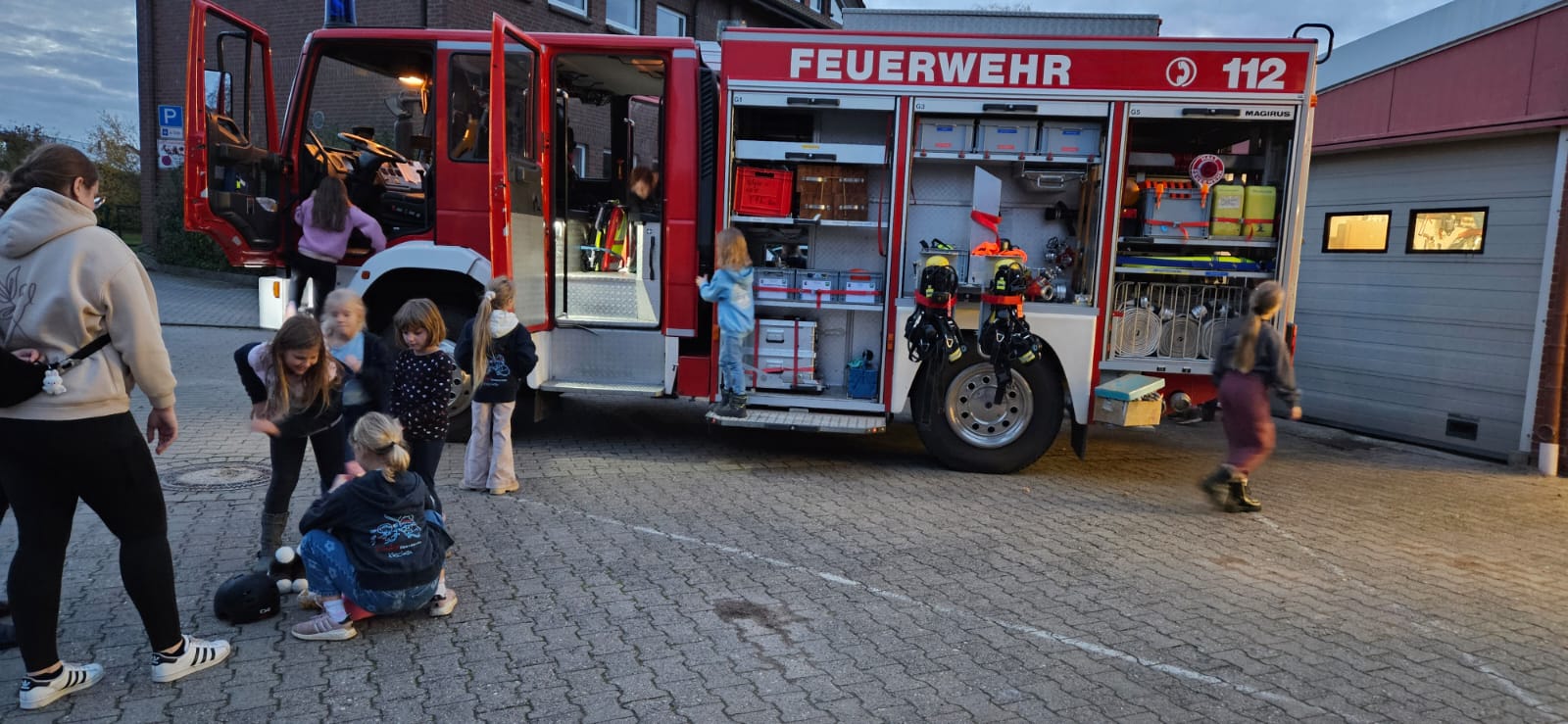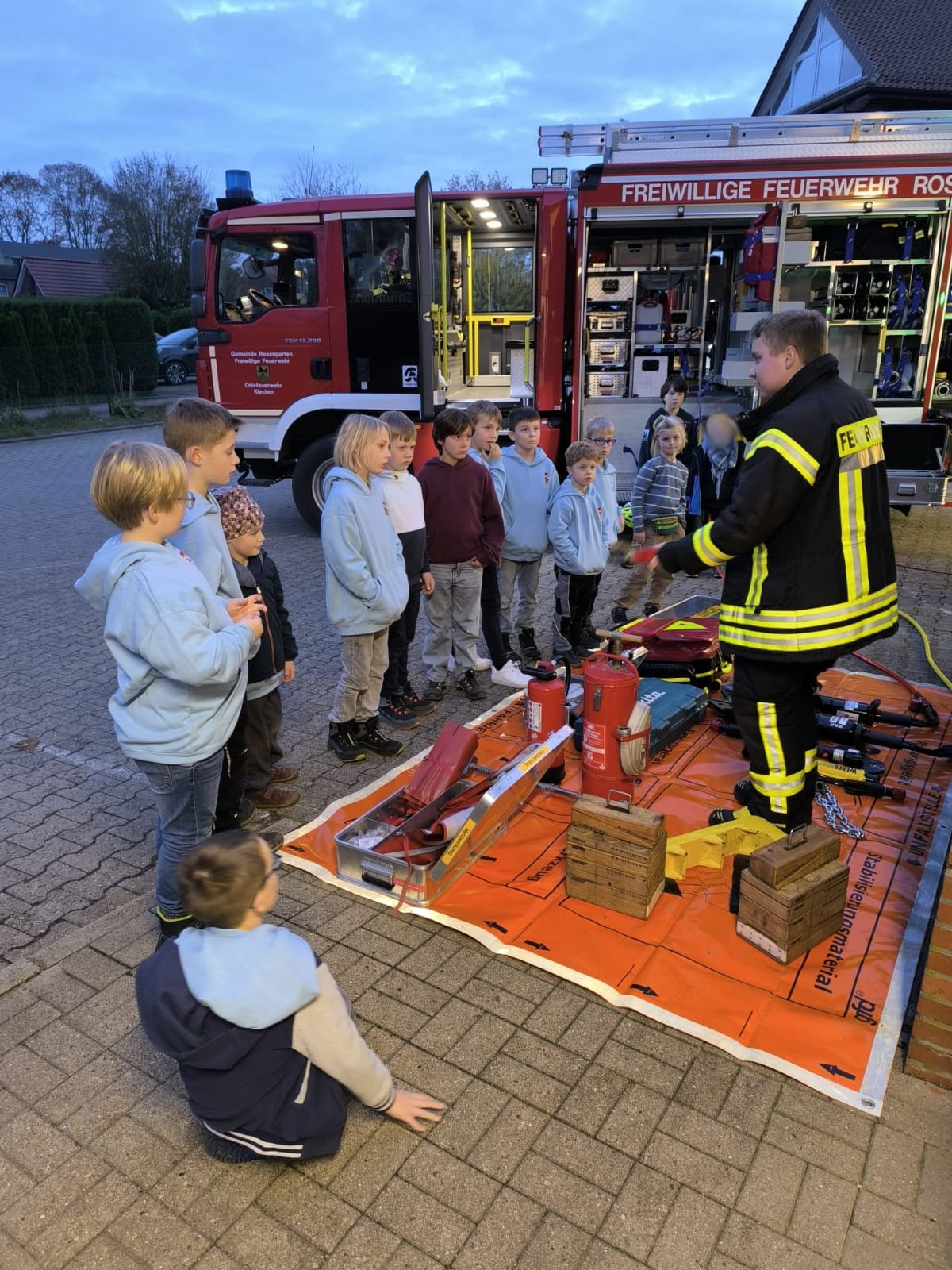 Zum Einstieg wurde ein lustiges Aufwärmspiel gespielt, bei dem alle viel gelacht haben und sich kennenlernten. Danach durften die Kinder die Feuerwehrfahrzeuge der Feuerwehr Klecken genau unter die Lupe nehmen. Dabei entdeckten sie einige Dinge, die eigentlich gar nicht in ein Feuerwehrfahrzeug gehören – das sorgte natürlich für große Begeisterung und viele Lacher!