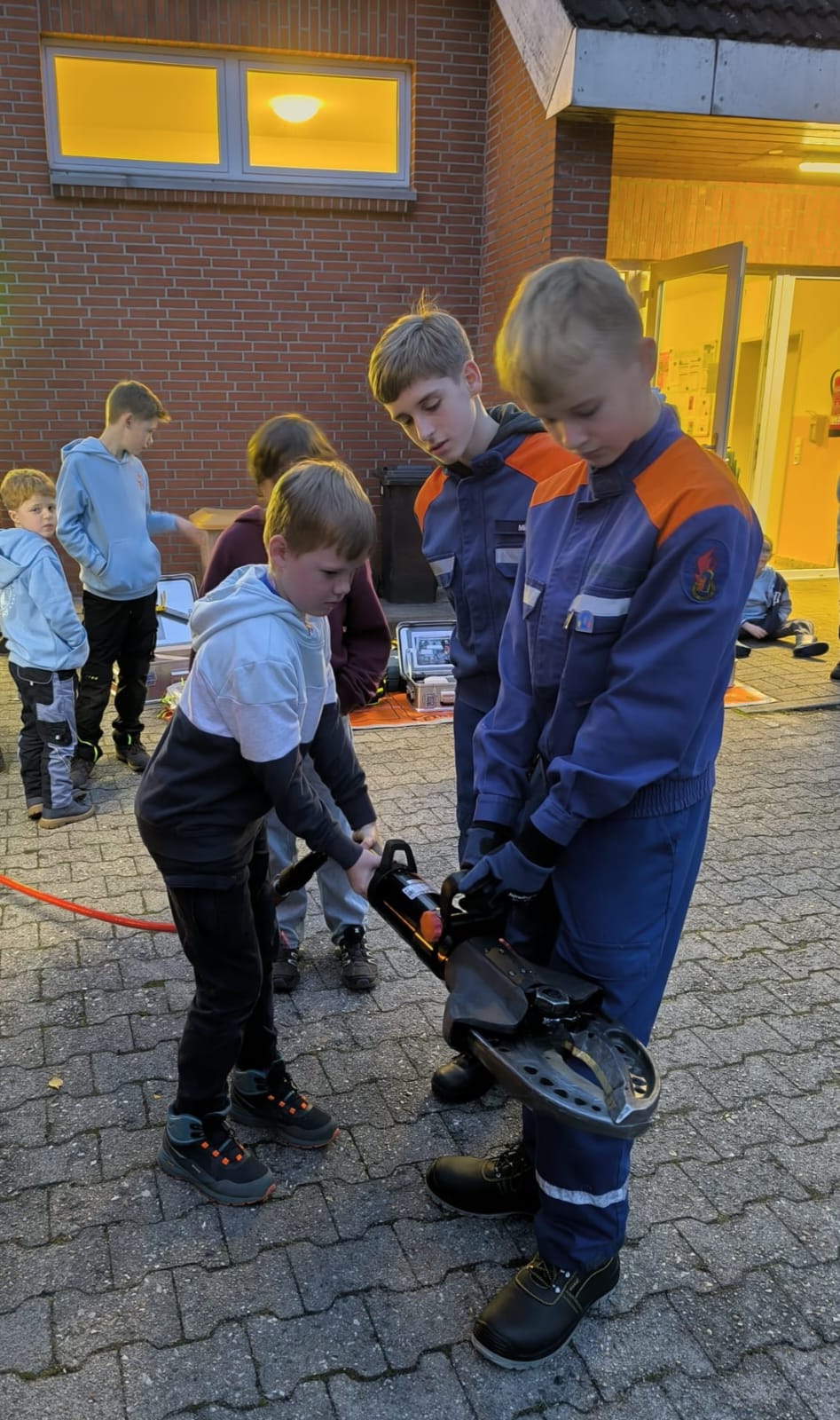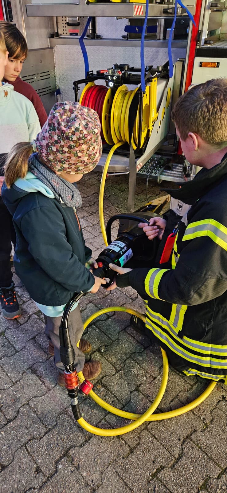 Im Anschluss konnten die Kinder verschiedene Feuerwehrgeräte ausprobieren und selbst aktiv werden. Ob Hydraulikschere, Spreizer oder andere Ausrüstungsgegenstände – alle waren mit Eifer und Neugier dabei.