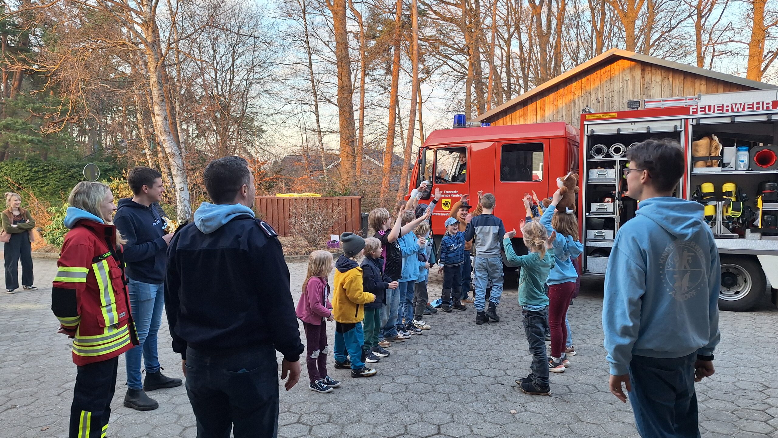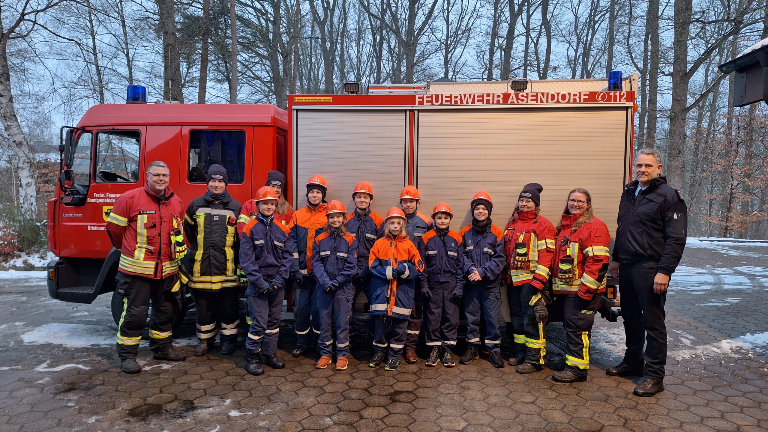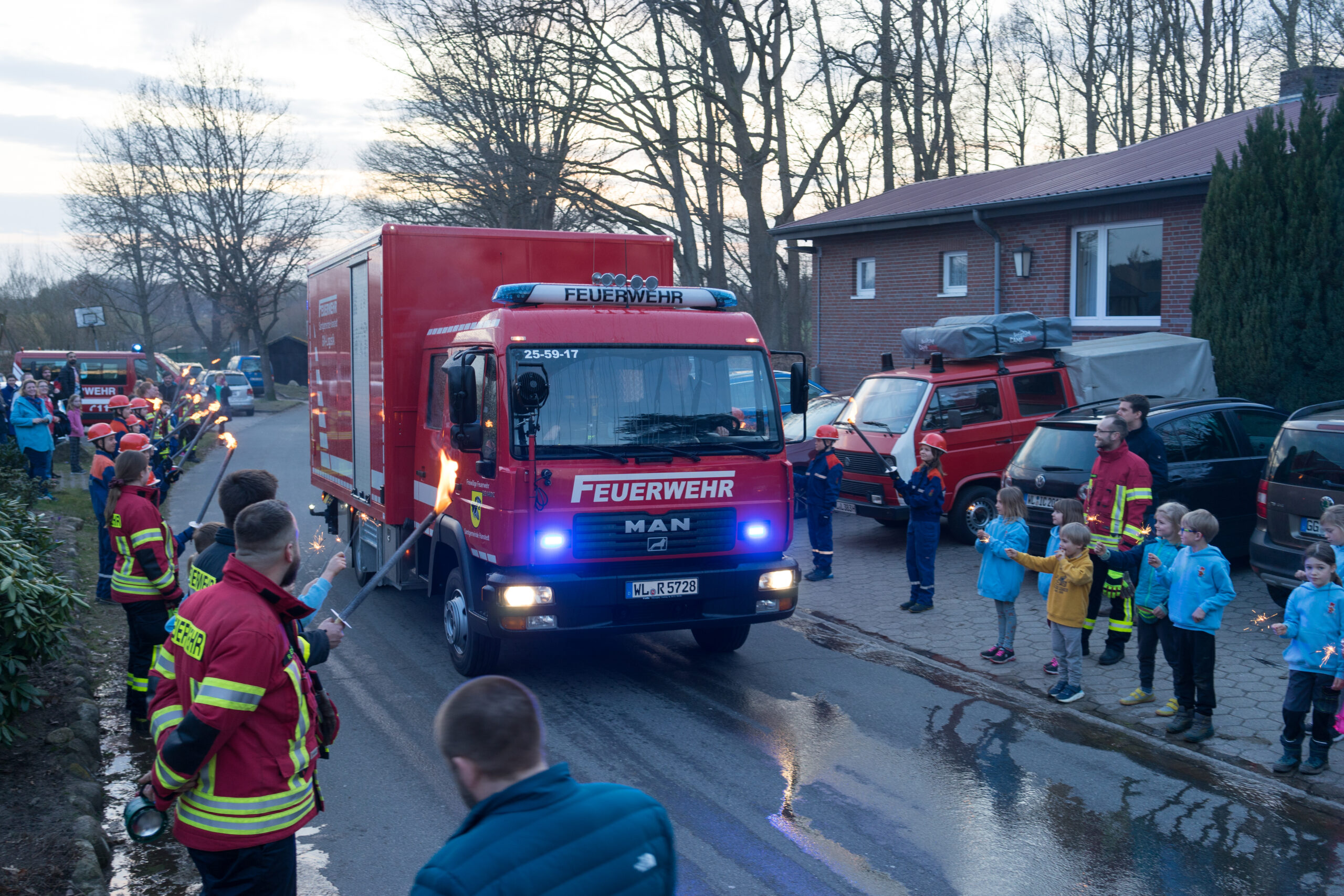 Standesgemäß wurde er auf der einen Seite des Fahrzeugs von seinen Kinderfeuerwehrkameradinnen und -kameraden verabschiedet und auf der anderen Seite von der Jugendfeuerwehr in Empfang genommen.